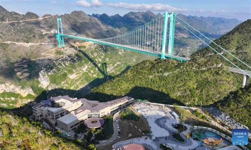 This drone photo taken on Nov. 6, 2025 shows tourists viewing the Huajiang Grand Canyon Bridge at the nearby Yundu service area in southwest China's Guizhou Province. The Huajiang Grand Canyon Bridge, soaring 625 meters above the Beipan River in Guizhou's mountainous terrain, is the world's highest bridge. The nearby Yundu service area features a comprehensive complex that integrates bridge viewing, sports experiences and other tourism services.