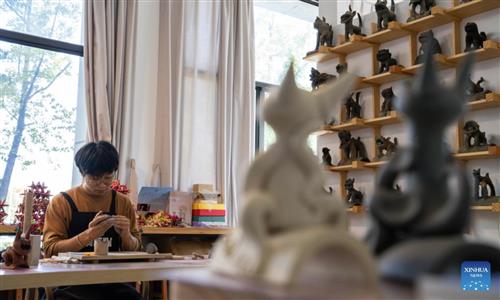 Zhang Hang collects images of Wamao with his camera at Haiyan Village in Kunming, southwest China's Yunnan Province, Nov. 12, 2025. Zhang Hang, 32, is an inheritor of the Kunming Wamao-making technique and the founder of the Heart Chamber Wamao Museum. Wamao, a cat-shaped pottery artifact originating in Yunnan, combines practical design with folk beliefs. Traditionally mounted on eaves or lintels, it was believed to drive away evil spirits and bring peace to the household. In 2023, Wamao was listed as one of Yunnan's provincial intangible cultural heritage items.