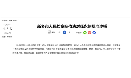 The People's Procuratorate of Xinxiang City has approved the arrest of Shi Yongxin, the former abbot of the Shaolin Temple, on embezzlement of duties, misappropriation of funds and bribery by non-state personnel, the Xinhua News Agency reported. Previously, Shi Yongxin has been placed under investigation by multiple departments for the charge of criminal offenses. The case of Shi was investigated by the Xinxiang Municipal Public Security Bureau, designated by the Henan Provincial Public Security Department. The Xinxiang Municipal Public Security Bureau then requested the Xinxiang Municipal People's Procuratorate to approve the arrest.