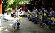 Little apprentices practice Kungfu at the Shaolin Temple on the Songshan Mountain in Dengfeng City, central China's Henan Province, July 21, 2016. Lots of children across the country came to the Shaolin Temple to learn Kungfu and Shaolin culture during the summer vacation.