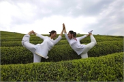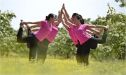 Yoga lovers practise yoga amid hawthorn blossoms in Qinghe County, north China's Hebei Province, April 28, 2017.