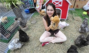 A visitor poses for photo with silky chickens during the 7th Pet Variety show at the IMPACT Muang Thong Thani Exhibition and Convention Center in Bangkok, Thailand, Dec. 14, 2017.