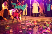 Young people gently put their hand-made krathong, a beautifully decorated basket made from banana leaves, into the fountain. Their faces lit up with smiles as they watched their basket slowly float away in the water.