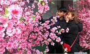 A couple take selfies among peach flowers on the Valentine's Day in Jinan, capital of east China's Shandong Province, Feb. 14, 2017. (Xinhua/Guo Xulei)