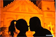 A couple kiss in front of a church in Xinjiang County, north China's Shanxi Province, Feb. 13, 2017.
