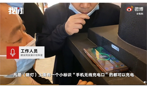 Several street lamps on a commercial district of Wuhan, Central China's Hubei Province, have become a hit with local residents and tourists thanks to their convenient wireless phone charging functions, ...