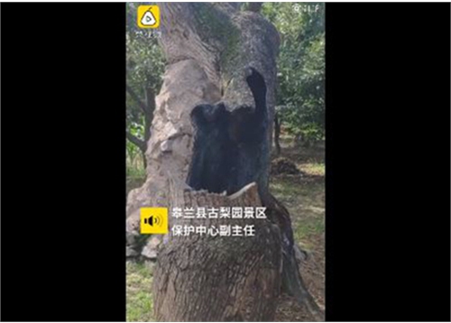 A 407-year old pear tree in Northwest China's Gansu Province that was hollowed out by fire was found to still be full of life and able to bear fruit.