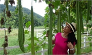 A visitor admires a super long squash at a farm in Yichang, Central China's Hubei Province which grows 50 varieties of squash and pumpkins. Photo: IC