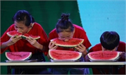 Three children participate in a watermelon eating contest at the 6th watermelon festival in Jishou, Central China's Hunan Province on Tuesday. Photo: VCG