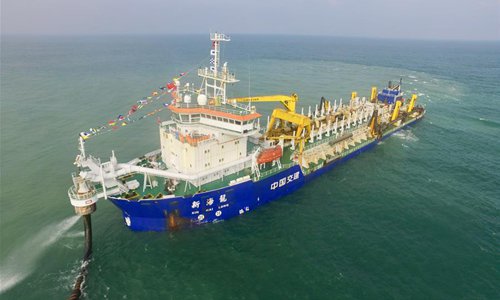 The dredger "Xin Hai Long" works at the construction site of the Colombo Port City project in Colombo Port City, Colombo, Sri Lanka on Jan. 16, 2019. A China-funded port city being constructed in Sri Lanka's capital Colombo has completed the reclamation of land from the sea and will soon be ready for the second phase, China's CHEC Port City Colombo (Pvt) Ltd. said on Wednesday. (Xinhua)