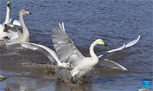 In pics: whooper swans at Xiaosugan lake wetland in NW China's Gansu