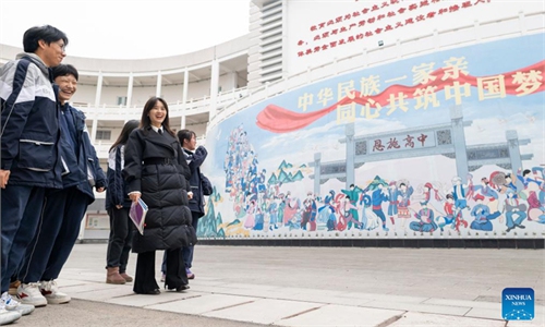 People enjoy tabebuia chrysantha blossoms in Guangzhou, China's Guangdong