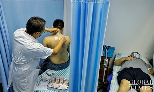 300 traditional Chinese medicine users arrive at Beijing Haidian Hospital on Wednesday morning to pick up and receive their Dog Days ointment patch on the first day of Dog Days, ...