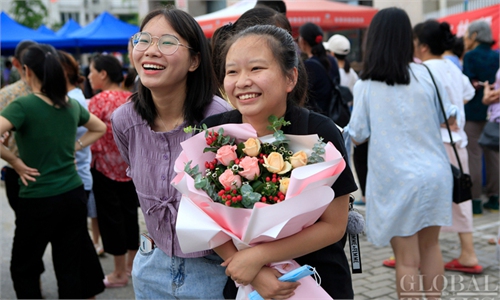 Following the last day of China's national college entrance examination in Beijing, family members and friends greet student candidates upon the completion of their exams with flowers. The gaokao exams ...
