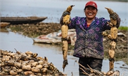 Farmers in Gaoling village, Xianning city, Central China's Hubei, harvested lotus roots on Tuesday. Due to the impact of the COVID-19 outbreak, the price per kilo has dropped to 1.3 ...