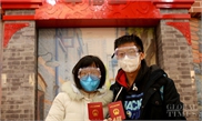 Many couples registered marriages on Feb 14, 2020, Valentine's Day, in Shanghai. Due to the COVID-19, they had to make appointments in advance, line up with a distance of one ...