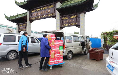 At the smart delivery depot in Beijing's Yizhuang economic development zone, logistics workers help sort packages on November 11. The depot combines manual and machine sorting. According to JD, the ...
