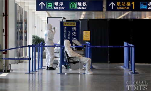 Shanghai Pudong International Airport maintains closed-off management in its T1 and T2 terminals, with all inbound passengers from abroad passing customs through enclosed passages after reports of 16 new imported ...
