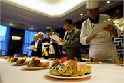 Two bakers chat at the 22nd International Exhibition for the Food & Hotel Industry held in Shanghai on Wednesday. Many exhibitors were cooking food on site to showcase their F&B ...