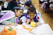Girls in Halloween costumes work on a pumpkin at Shanghai Zoo on Wednesday. The zoo organized a Halloween party for kids to learn and observe the dietary habits of different ...