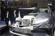 Visitors check out a car that runs on hydrogen fuel at the China International Import Expo (CIIE) on Monday. The car was developed by South Korean company Hyundai.