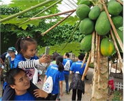 A little girl sitting on her dad's shoulders takes photos of fruit on a tree during a walking race held in Luojing town of Boshan district Sunday. More than 3,000 ...