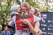 A female athlete embraces a child and a friend at the IRONMAN 70.3 Shanghai on Sunday. The event, also known as a “half ironman,” was held at the city's Chongming ...