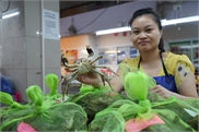 A hairy crab retailer picks up a crab at a local wet market in Yangpu district on Thursday.