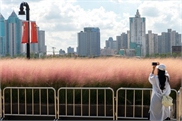 A visitor takes photos of a scenic view of luxuriant hairawn muhly (Muhly grass) on the East Bund in Yangpu district on Friday.
