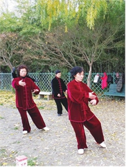 Women do tai-chi at a green space in Shanghai on Tuesday. Many local elders choose to spend their morning leisure hours at parks doing martial arts, dancing, singing or playing ...