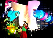An artist from Picto Facto, a French puppeteer group, performs during a light show on Tuesday Evening at Xintiandi of Shanghai's Huangpu district. The group danced together with local audiences, ...