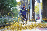 A janitor cleans up fallen leaves with a blowing machine along Changping Road of Shanghai on Thursday. Shanghai was hit with a cold front on Wednesday, which has brought frigid ...