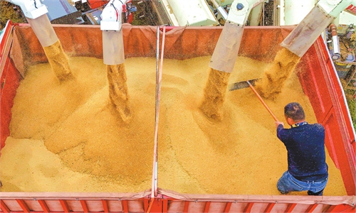 A farmer loads harvested millet into a grain transport truck at a millet planting base in Luying Town, Nanyang City in Central China's Henan Province on October 19, 2025. The latest update from the Ministry of Agriculture and Rural Affairs showed that nearly 70 percent of China's autumn grain has been harvested. Photo: cnsphoto
