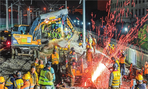 A view of the construction site of the high-speed railway in Hefei, East China's Anhui Province, on October 24, 2025. After more than 1,100 construction workers worked continuously for five hours, the Hefei–Anqing high-speed railway was connected to the Hefei hub EMU access track, further enhancing the city's role as a national comprehensive transportation hub.Photo: cnsphoto