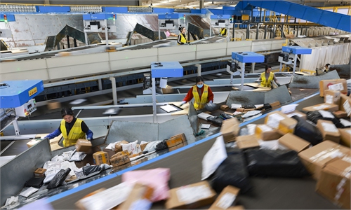 Workers sort parcels at a logistics center in Guangrao county, Dongying, East China's Shandong Province, on November 9, 2025. Data from the State Post Bureau showed on Saturday that since November, China's daily express delivery volume has exceeded 600 million parcels on several consecutive days, underscoring the vitality of the market, and the key role of the express sector in boosting consumption. Photo: VCG