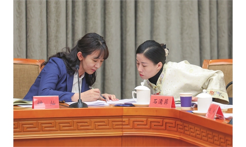 Shi Rufei (right) and Zhong Can, both deputies to the National People's Congress (NPC), exchange ideas during a group discussion of the Guangxi delegation at the fourth session of the 14th NPC in Beijing, on March 10, 2026. Photo: VCG