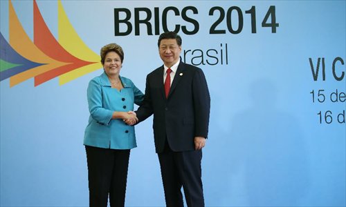 Chinese President Xi Jinping (R) shakes hands with Brazilian President Dilma Rousseff during the sixth BRICS summit in Fortaleza, Brazil, July 15, 2014.
