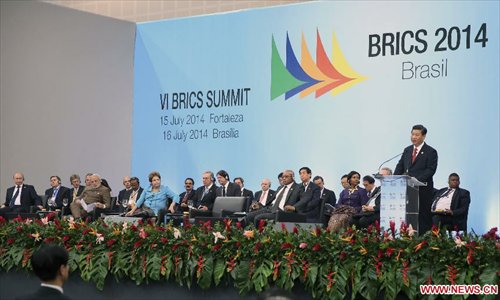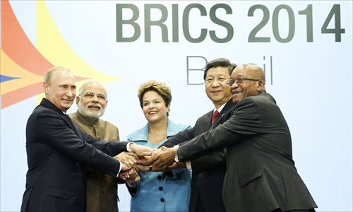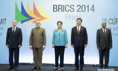 Chinese President Xi Jinping poses for a group photo with Russian President Vladimir Putin, Indian Prime Minister Narendra Modi, Brazilian President Dilma Rousseff, and South African President Jacob Zuma during the sixth BRICS summit in Fortaleza, Brazil, July 15, 2014.