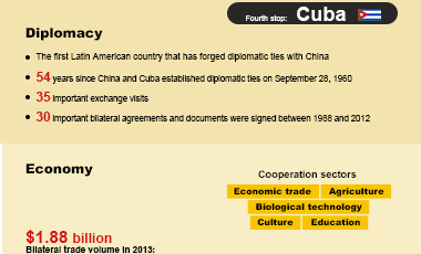 | July 21-23 Cuba | Meet with Raul Castro, president of the Council of State and the Council of Ministers of Cuba | Will sign multiple documents on economy and trade, agriculture, biotechnology, culture, education and other fields. |