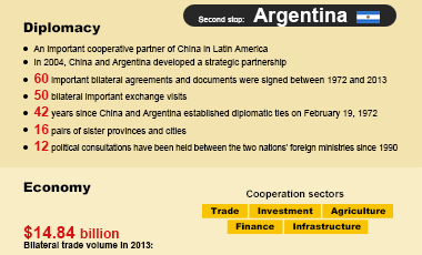 | July 18-20 Argentina | Meet with Argentine President Cristina Kirchner | Will ink a series of cooperative documents in trade, investment, agriculture, finance and infrastructure. |
