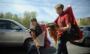 Two volunteers distribute the St. George Ribbon, a symbol of fire and gunpowder, in Moscow's Red Square on May 8, one day before the parade marking the 70th anniversary of the victory of the Great Patriotic War, Russia's term for WWII, is held.