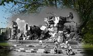 A destroyed fountain at Luetzowplatz in Berlin, Germany after World War II in 1945. The image is superimposed on a photo taken from the same perspective on April 29, 2015.