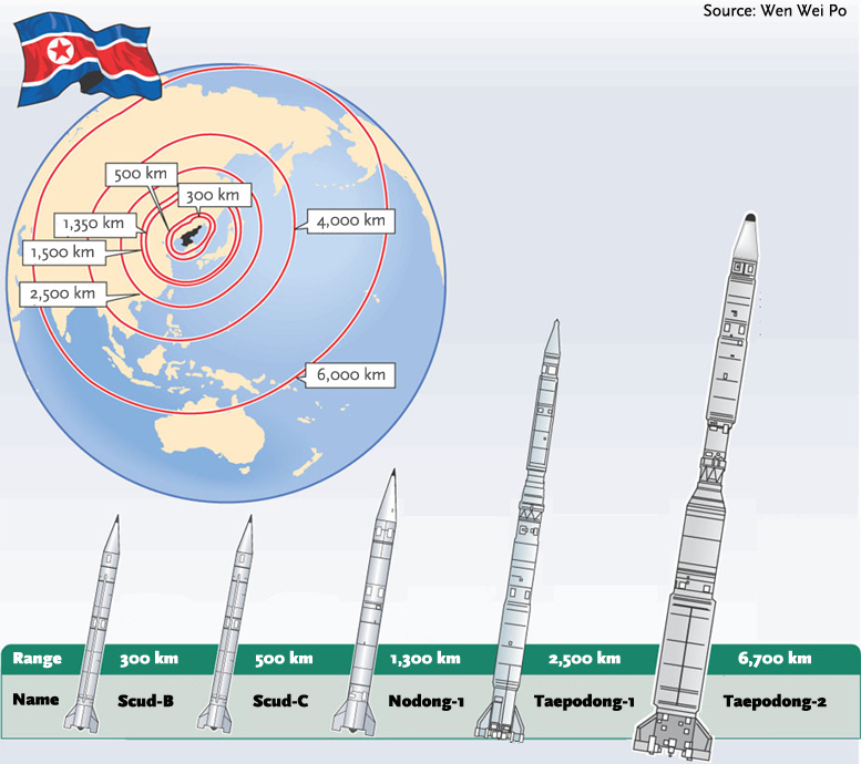 Missile name: Taepodong-2; Range: 6,700km |