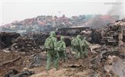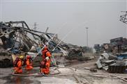 Firefighters wearing chemical protective clothing work at Tianjin explosion site
