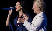 Singer Katy Perry (L) speaks beside Democratic presidential nominee Hillary Clinton during a Get Out the Vote Concert at the Mann Center for the Performing Arts on Saturday in Philadelphia, Pennsylvania (see story on page 7).