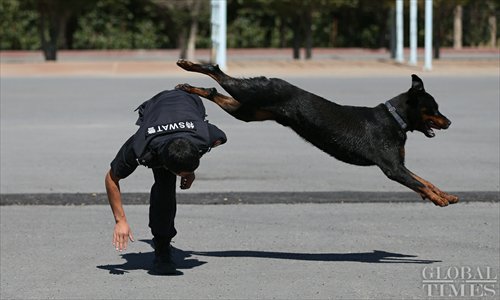 Police dogs of the No.8 Special Police Force detachment of the Xinjiang Urumqi Public Security Bureau help officers in tracking, bomb-sniffing and drug searches.