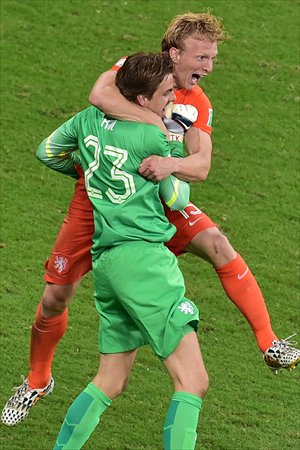 Substitute goalkeeper Tim Krul produced two decisive saves in the penalty shootout to lift Netherlands 4-3 over Costa Rica after a scoreless 120-minute play in the last quarterfinal match of 2014 World Cup on Saturday.