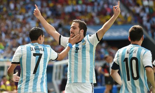 Gonzalo Higuain scored his first goal at the Brazil World Cup Saturday, helping Argentina breaking the jinx of non-semifinalists for 24 years.