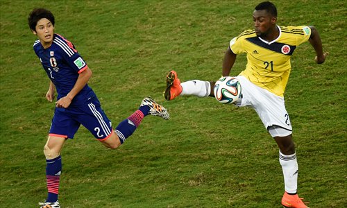 Colombia’s forward Jackson Martinez (right) vies with Japan’s defender Atsuto Uchida at the Pantanal Arena in Cuiaba during the 2014 FIFA World Cup in Brazil on Tuesday.