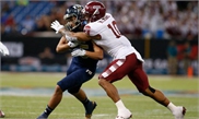 Wide receiver Austin Maloney, No.15 of the FIU Golden Panthers, is stopped by defensive back Mike Jones, No.10 of the Temple Owls, during the third quarter of the Bad Boy Mowers Gasparilla Bowl on Thursday at Tropicana Field in St. Petersburg, Florida. Temple earned its third bowl win in program history, a 28-3 victory over the Panthers.